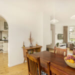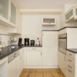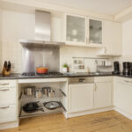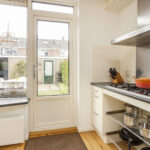 Aan de tuinzijde ligt de halfopen keuken, uitgevoerd in een lichte kleurstelling en voorzien van diverse inbouwapparatuur, waaronder een combi-oven, vaatwasser, 5-pits gasfornuis en afzuigkap. De keuken biedt tevens toegang tot de eetkamerhoek, die in directe verbinding staat met de tuin.