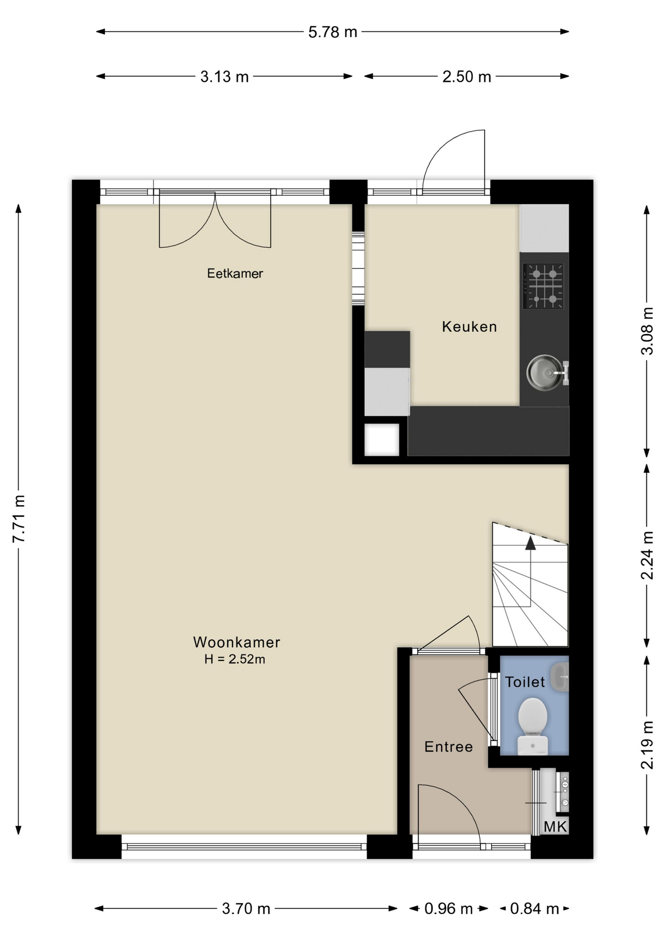 Via de verzorgde voortuin bereik je de entree. In de hal bevinden zich de meterkast, de toegang tot het toilet en de doorgang naar de woonkamer.