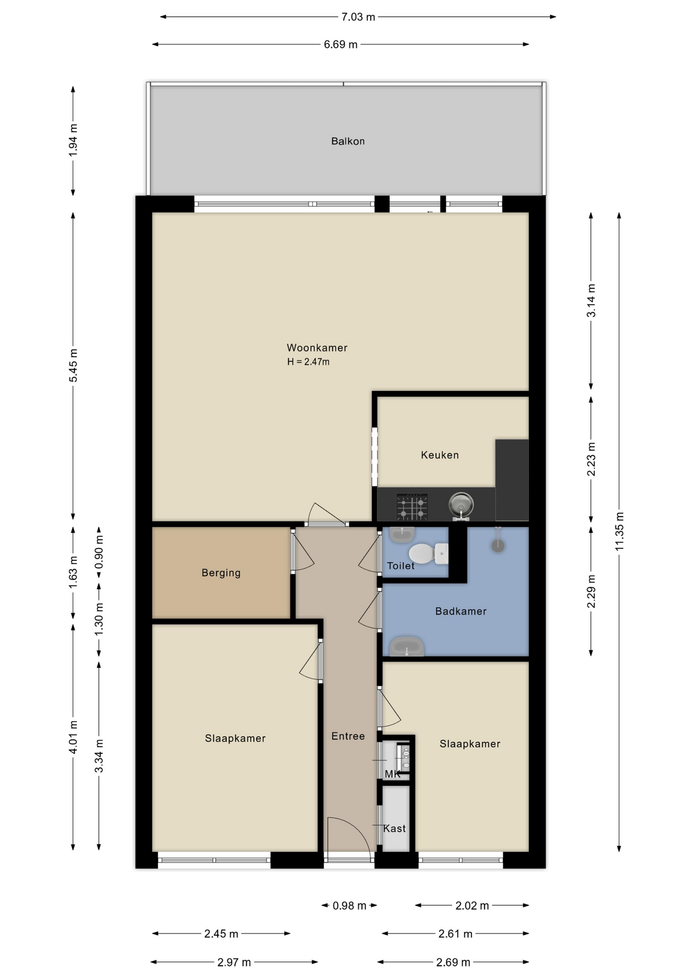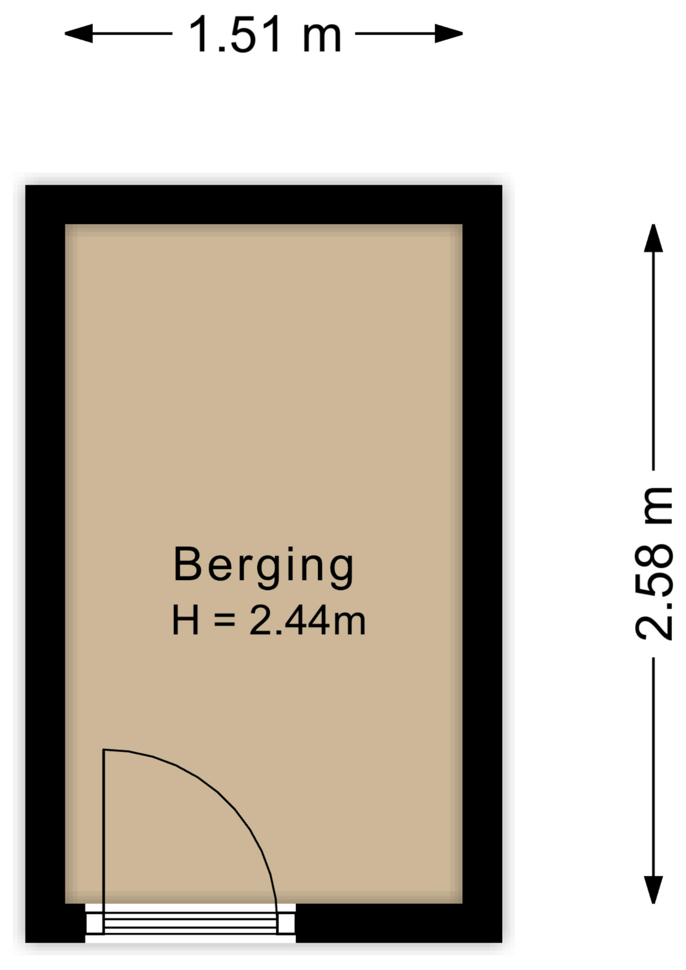 Entree, hal met toegang tot 2 slaapkamers, berging. Separaat toilet. Badkamer met wastafel, douche en aansluiting voor het witgoed.