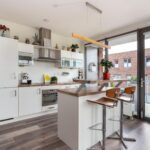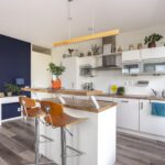 Je hebt de beschikking over een moderne open keuken met houten werkblad en bar, die plek biedt voor twee barkrukken. De keuken is uitgerust met Pelgrim inbouwapparatuur: een vaatwasser, combi-oven, koel-vriescombinatie, kookplaat en RVS afzuigkap. In de bovenkasten kun je lekker veel spullen kwijt.