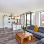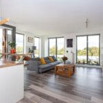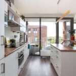 Doordat dit een hoekappartement betreft, beschikt de ruime woonkamer over bijzonder veel raampartijen (6 stuks), waarvan een met deur richting het balkon. Door de ramen kijk je mooi vrij uit op een brede groenstrook met daarachter het treinspoor. De woonkamer is prachtig afgewerkt met een glad plafond en mooie laminaatvloer.