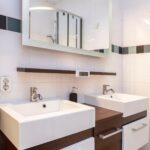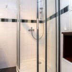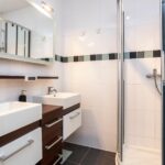 In de nette badkamer heb je de beschikking over een douche en breed dubbel wastafelmeubel met daarboven een verlichte spiegel.