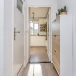 Je stapt het appartement in via een eigen voordeur, afgeschermd door de tuin van de benedenburen. Via de hal en trap met ruimte voor een garderobe en bergruimte boven de trap bereik je de woning op de eerste verdieping