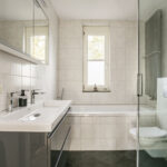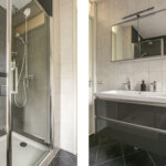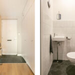 De badkamer heeft een moderne uitstraling en is voorzien van een dubbele wastafel, ruime douche, ligbad, zwevend toilet en designradiator. Het raam zorgt voor natuurlijk daglicht en ventilatie – comfortabel én energiezuinig.