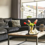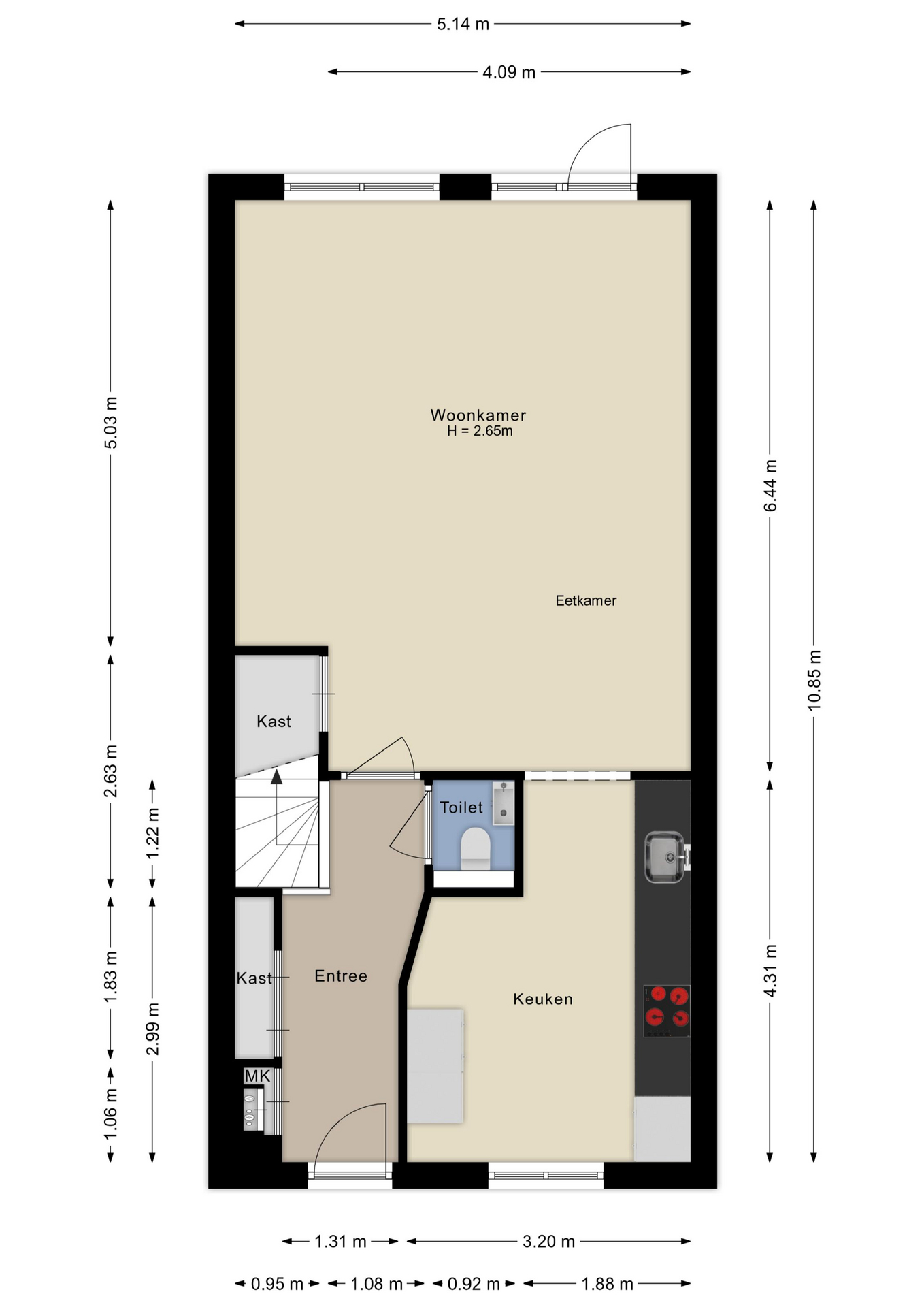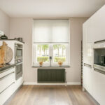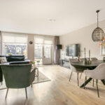 Via de ruime hal met garderobekast, meterkast en modern toilet kom je in de lichte woonkamer. Grote ramen en de openslaande deur zorgen voor veel daglicht en een prettige verbinding met de tuin. De houten parketvloer (recent geschuurd) en strak afgewerkte wanden geven de ruimte een rustige en tijdloze uitstraling.