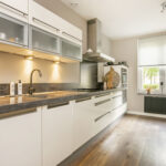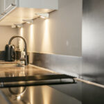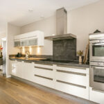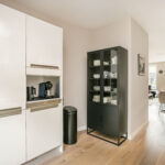 De halfopen keuken aan de voorzijde is modern en praktisch ingericht. De hoogglans kastfronten en bovenkastjes met melkglas zorgen voor een frisse uitstraling. De keuken is uitgerust met een inductiekookplaat, afzuigkap, koelkast, vriezer, vaatwasser, combimagnetron en oven. De betonlook spatrand en het bijpassende aanrechtblad vormen één stijlvol geheel. De geïntegreerde coffee corner maakt het extra gezellig.