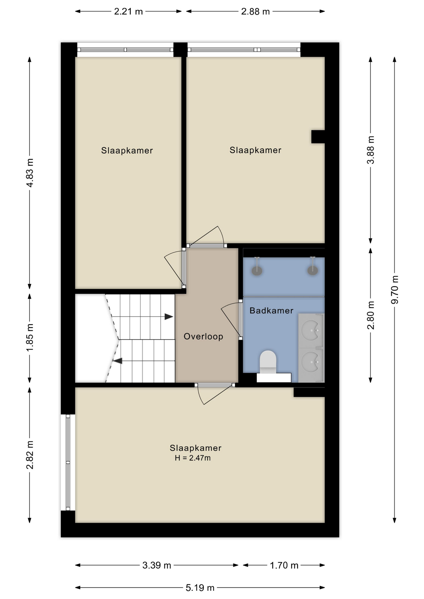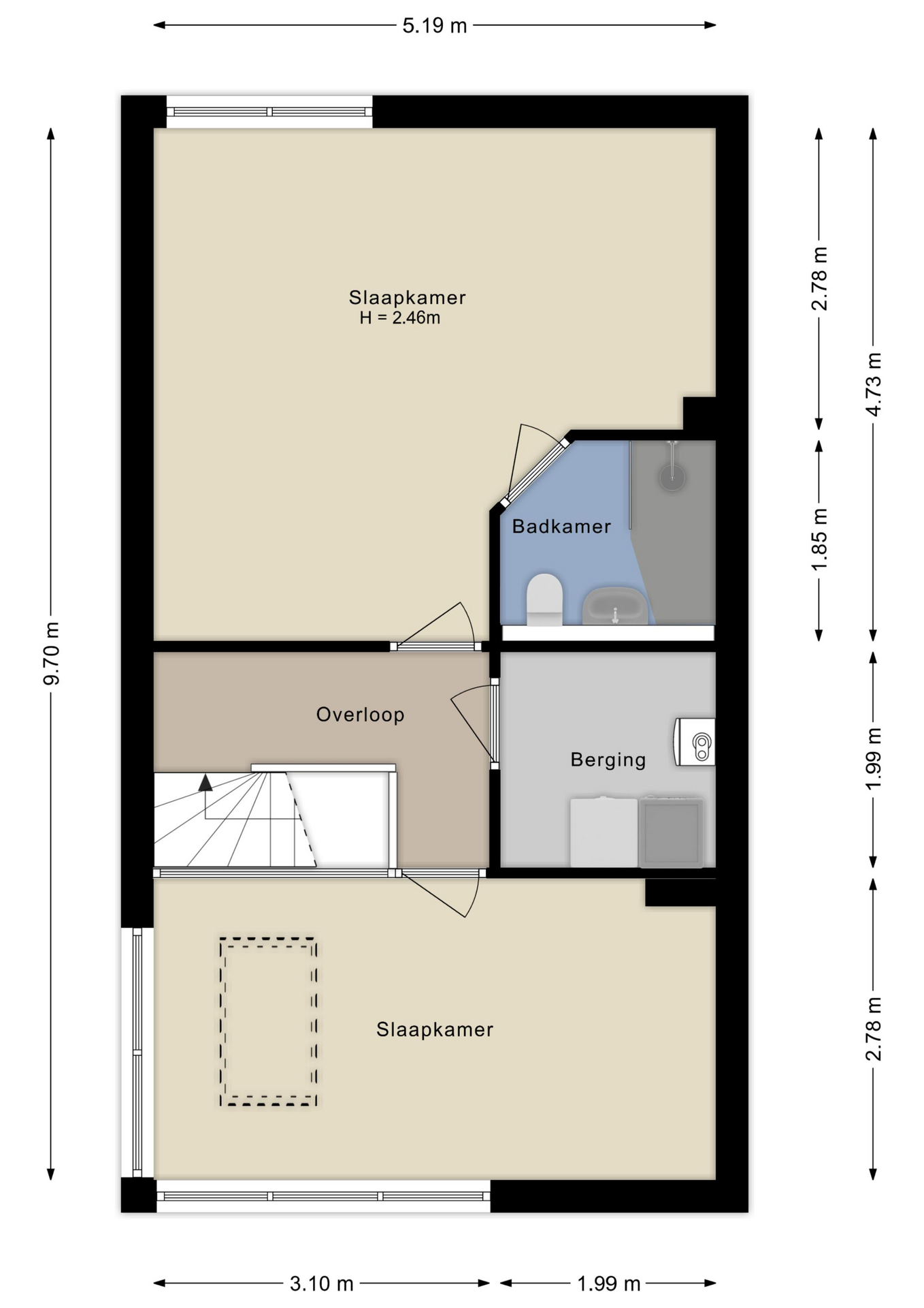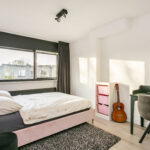De tweede verdieping biedt nóg meer ruimte en comfort. Op de overloop vind je extra bergruimte en de opstelling van de CV-combiketel en de aansluitingen voor wasmachine en droger. Aan de achterzijde ligt de royale master bedroom, uitgerust met airco en voldoende kastmogelijkheden. En alsof dat nog niet genoeg is, beschik je vanuit deze kamer over een tweede badkamer, compleet met ligbad/douche, wastafel, toilet en designradiator. Een luxe die je zelden tegenkomt! Aan de voorzijde bevindt zich nog een ruime kamer, momenteel in gebruik als werk- en muziekkamer. Het extra daglicht via de dakkoepel en de aanwezige airco maken dit een bijzonder prettige ruimte.