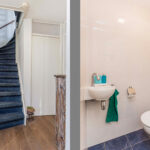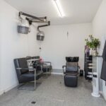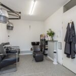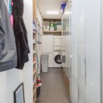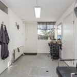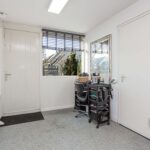 Entree, ruime hal met eikenhouten vloerdelen, gestucte wanden, modern afgewerkt en geheel betegeld toilet met hangend closet en fonteintje, meterkast, trapopgang en deur naar de grote multifunctionele werk-/salonruimte (voormalige garage). De (haar-)salon heeft een eigen entree en is voorzien van een vinylvloer en gestucte wanden en biedt toegang tot de bijkeuken in de zijaanbouw. Naast de wasmachine- en drogeraansluiting tref je hier tevens een brede kastenwand aan alsmede een extra buitendeur.