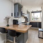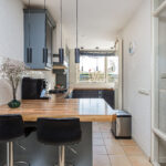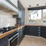De keuken is aan de voorzijde van de woning gelegen en is voorzien van een U-vormig keukenblok met kleine eetbar. Naast veel praktische werk- en kastruimte beschikt de keuken over een grote koelkast, 5-pits gaskookplaat, combimagnetron, schouw met afzuigkap en vaatwasser.