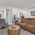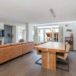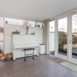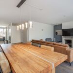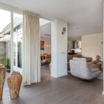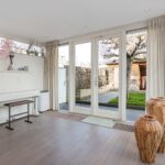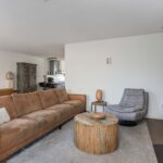 De living is royaal van afmeting, heeft door de uitbouw aan de achterzijde een speelse indeling en is zeer licht door de grote, tot aan de grond reikende raampartijen (serretype), die over de volle breedte van de woning strekken en fraai zicht op de tuin bieden. De stijlvol afgewerkte ruimte is voorzien van eikenhouten vloerdelen, gestucte wanden, open haard, trapkast en dubbele openslaande deuren die toegang bieden tot de achtertuin.