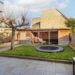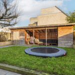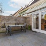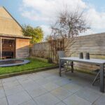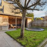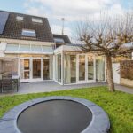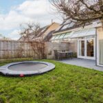 De achtertuin is vrij gelegen, modern aangelegd met sierbestrating, gazon en borders met vaste beplanting en is daarnaast voorzien van een houten schuur, ronde trampoline, tuinverlichting, elektrische zonwering, buitenkraan en elektra.