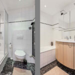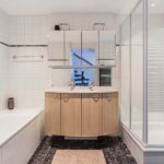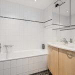 De modern afgewerkte badkamer is ruim van afmeting, geheel betegeld en voorzien van een ligbad met thermostaankraan, douchecabine met thermostaatkraan, breed badmeubel met dubbele wastafel, hangend closet en designradiator.