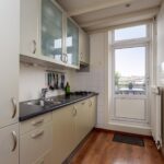 Bij aankomst op de 1e verdieping arriveert u in een afgesloten hal, waar de keuken en separate toiletruimte zijn gesitueerd. De toiletruimte is volledig betegeld en beschikt over een staand toilet. De keuken, voorzien van gasfornuis met afzuigkap, ingebouwde oven, koelkast en voldoende opbergruimte, is van alle gemakken voorzien en instapklaar. De keuken biedt tevens doorgang naar het dakterras.