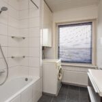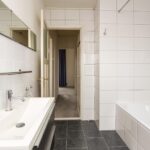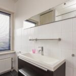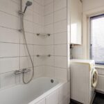 Vanaf de overloop kan ook de badkamer worden betreden. Deze beschikt over een ligbad met douchekop, wastafel met opbergmeubel en biedt mogelijkheid om een wasmachine aan te sluiten.