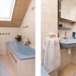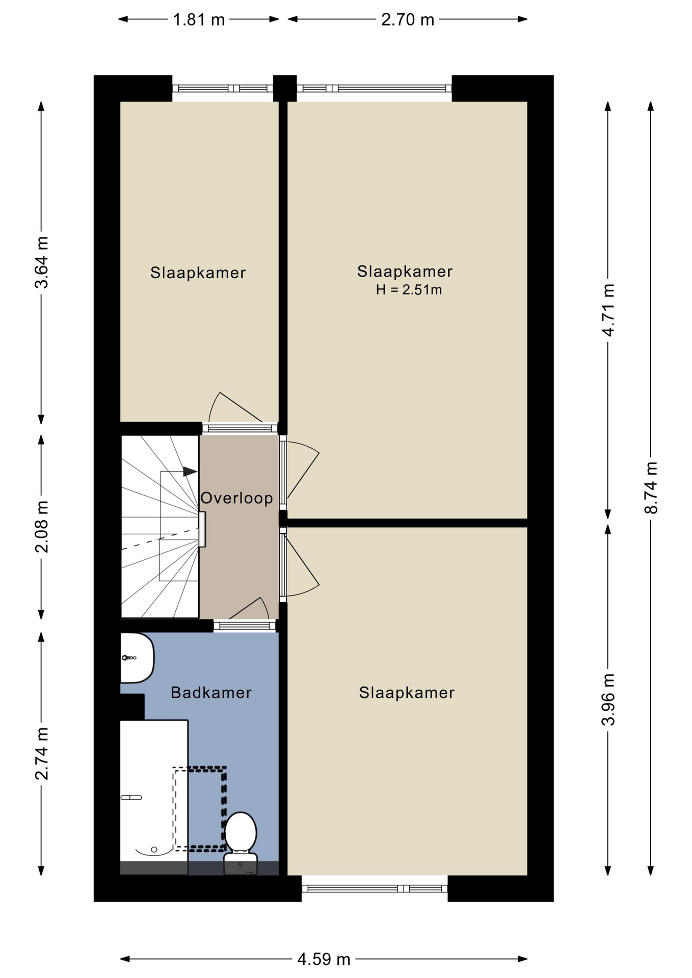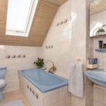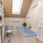 Hier bevinden zich een drietal goed bemeten slaapkamers en de ruime badkamer met ligbad, toilet en wastafel.