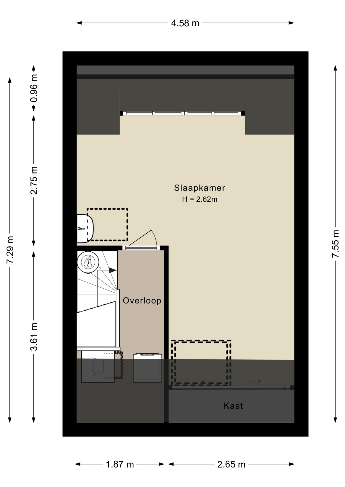 De overloop met wasmachine-aansluiting biedt toegang tot de vierde royale slaapkamer met dakkapel. Hier kunnen eenvoudig twee slaapkamers gecreëerd worden. Ook geeft deze toegang tot de bergvliering.