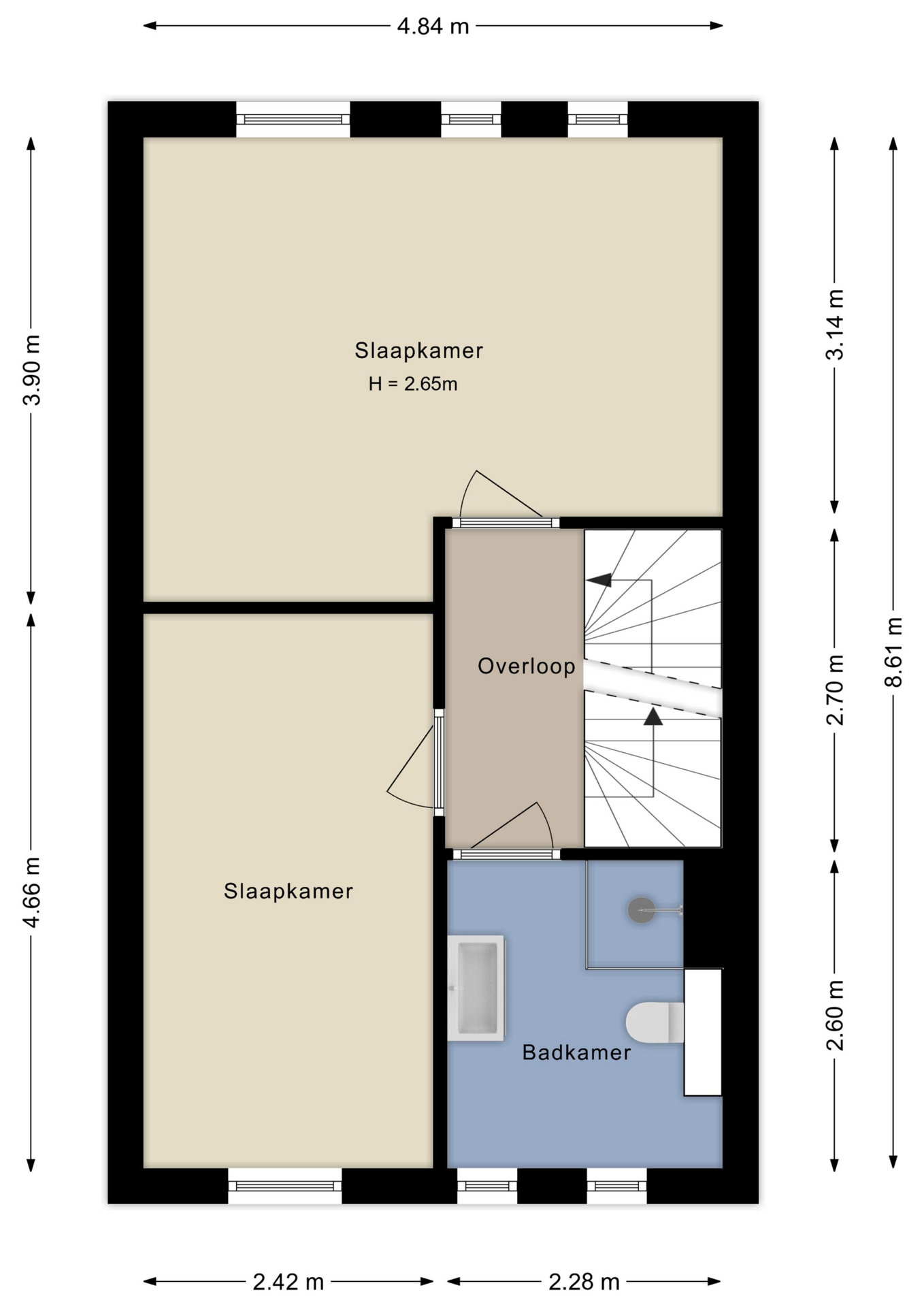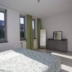 1e verdieping: twee ruime en lichte slaapkamers grenzend aan een grote overloop. De masterbedroom heeft uitzicht op de tuin en beschikt over een grote nis, waar de kast prima kan staan. De badkamer is netjes betegeld in natuurlijke grijstinten. Het heeft een inloopdouche, zwevend toilet en wastafelmeubel.