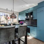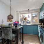 - Moderne eetkeuken met inbouwapparatuur en granieten blad;