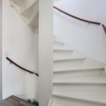 Overloop met laminaatvloer, gestucte wanden en trapopgang.