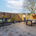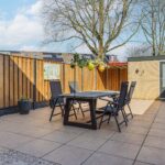De geheel vrij gelegen en ruime achtertuin is stijlvol aangelegd met moderne tegels en nieuwe schuttingen en is daarnaast voorzien van een stenen schuur met elektra en leuke overkapping achterin.
