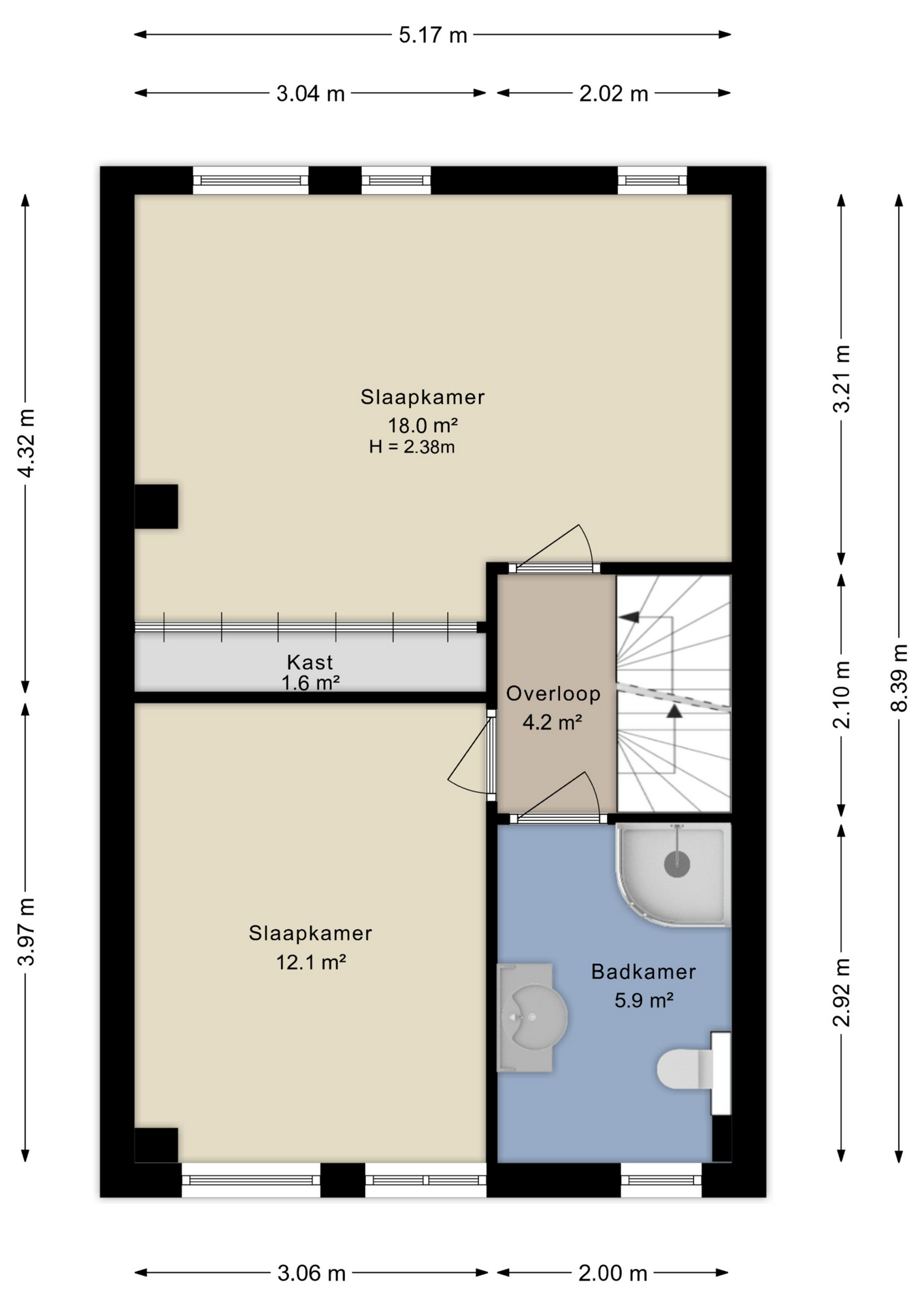 De 1e verdieping beschikt over twee (voorheen drie) slaapkamers van zeer ruim formaat met rechte gevels (geen ruimteverlies door schuine dakvlakken). Beide kamers zijn voorzien van een laminaatvloer en kunststof kozijnen met draai-/kiepramen en horren. De slaapkamer aan de voorzijde beschikt daarnaast over een elektrisch rolluik.