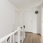 Overloop met laminaatvloer, grote bergkast en luik met vlizotrap naar de bergvliering.