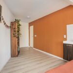 De tuingerichte living is met circa 32m2 woonoppervlakte ruim van afmeting en is heerlijk licht door de grote raampartij -en tuindeur. De kamer is voorzien van mooie houten vloerdelen, gestucte wanden -en plafond en praktische trapkast met tweede houten schuifdeur.