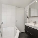 De modern uitgevoerde en geheel betegelde badkamer is voorzien van een ligbad met thermostaatkraan, douchecabine met thermostaatkraan, badmeubel met wastafel en bijpassende spiegelkast, hangend closet, designradiator en raampartij.