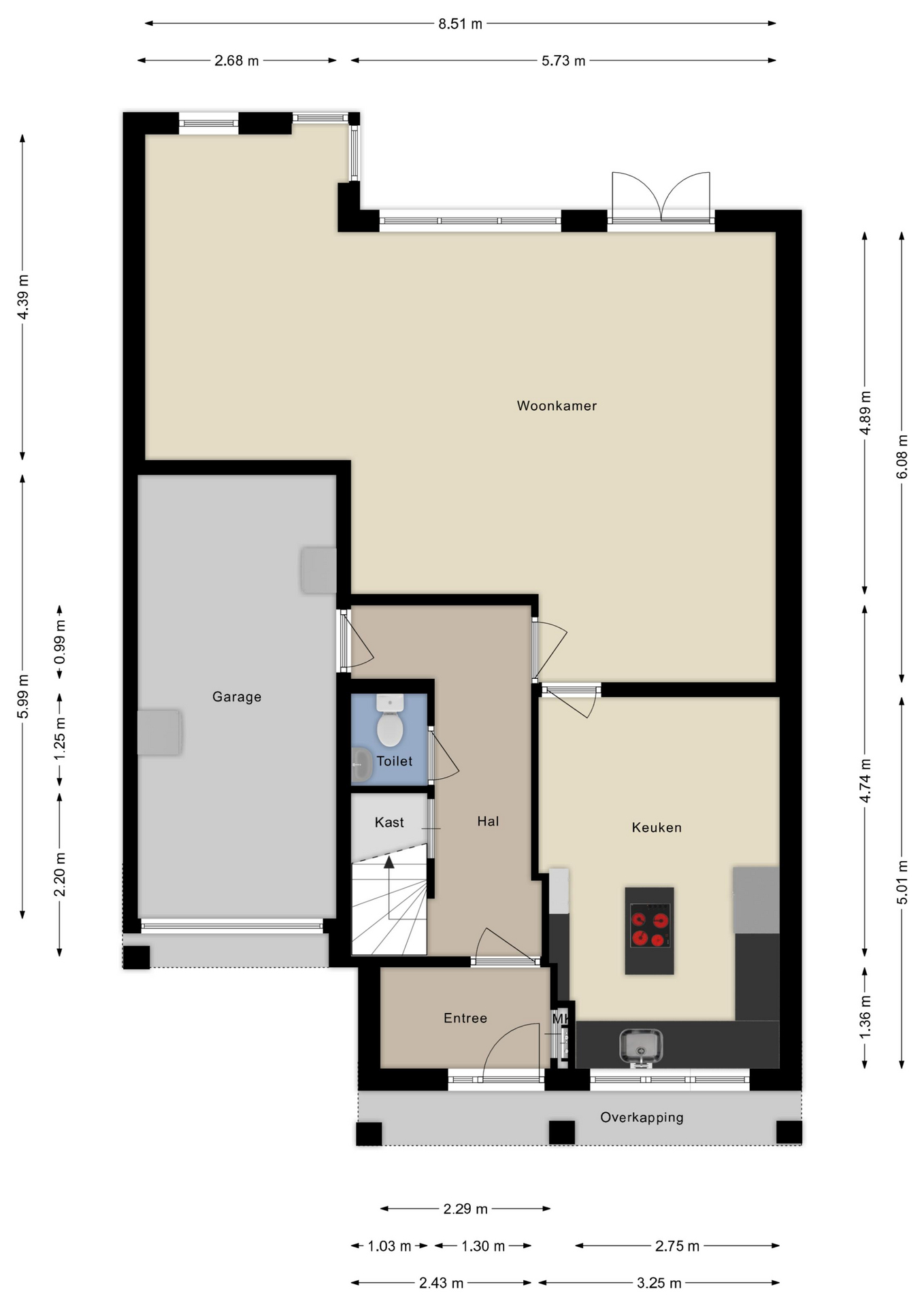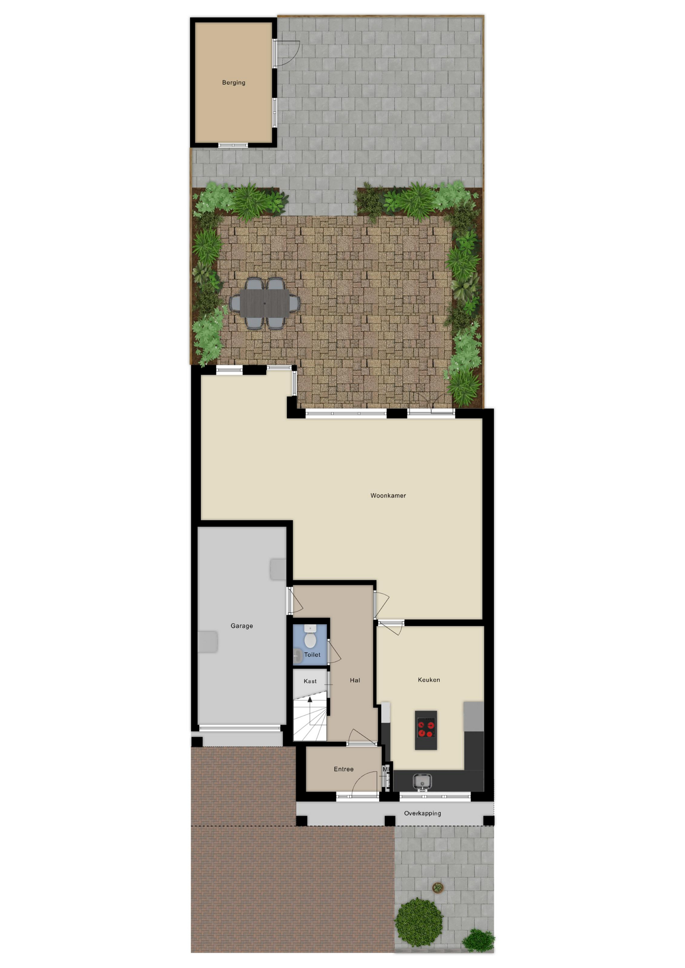 Entree, hal met meterkast, bergkast, een net toilet met fontein en toegang tot de garage. De woonkamer bevindt zich aan de achterzijde van de woning en is vergroot door een gedeeltelijke uitbouw en het bijtrekken van een deel van de garage. Openslaande deuren geven toegang tot de zonnige achtertuin met houten berging.
