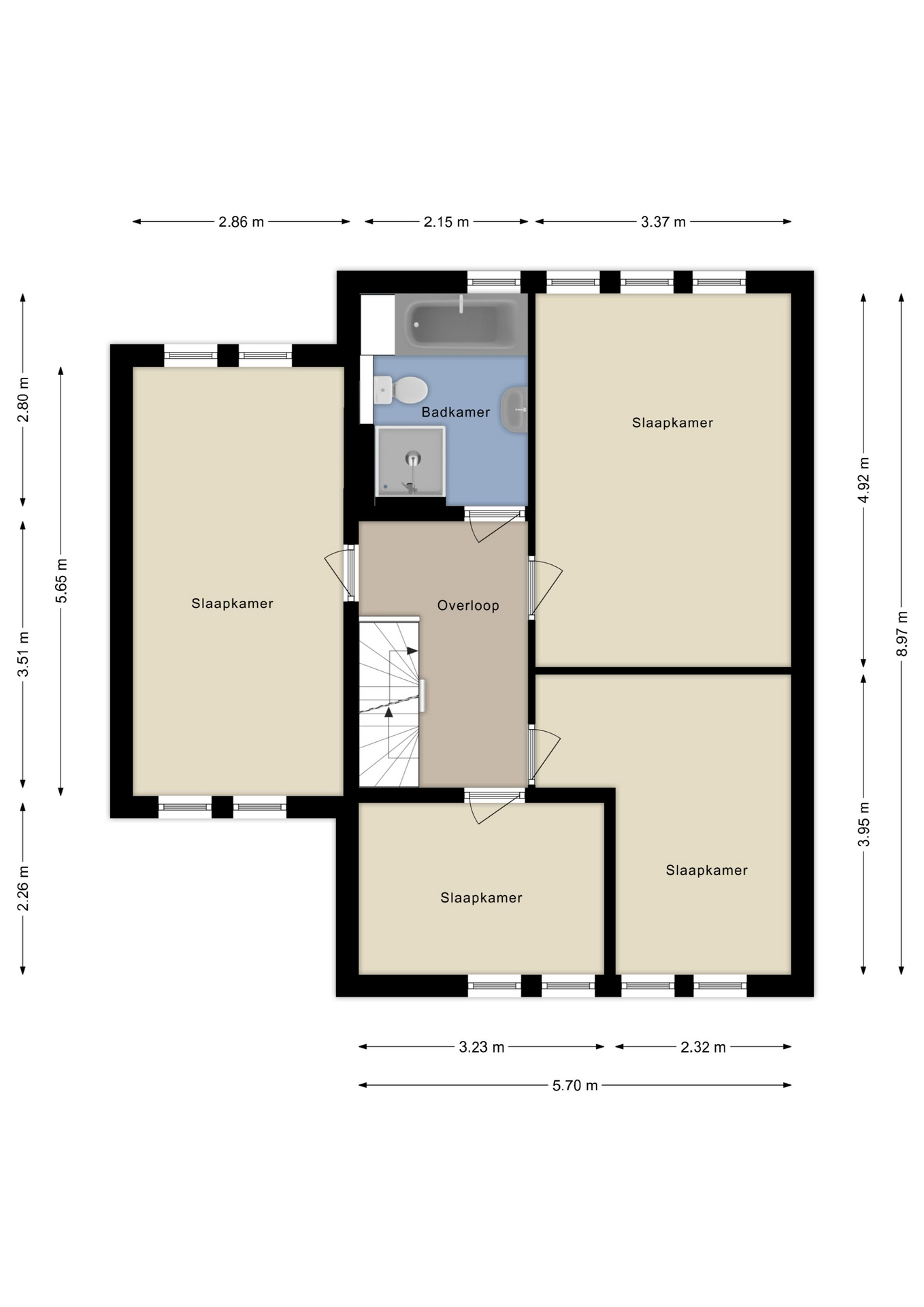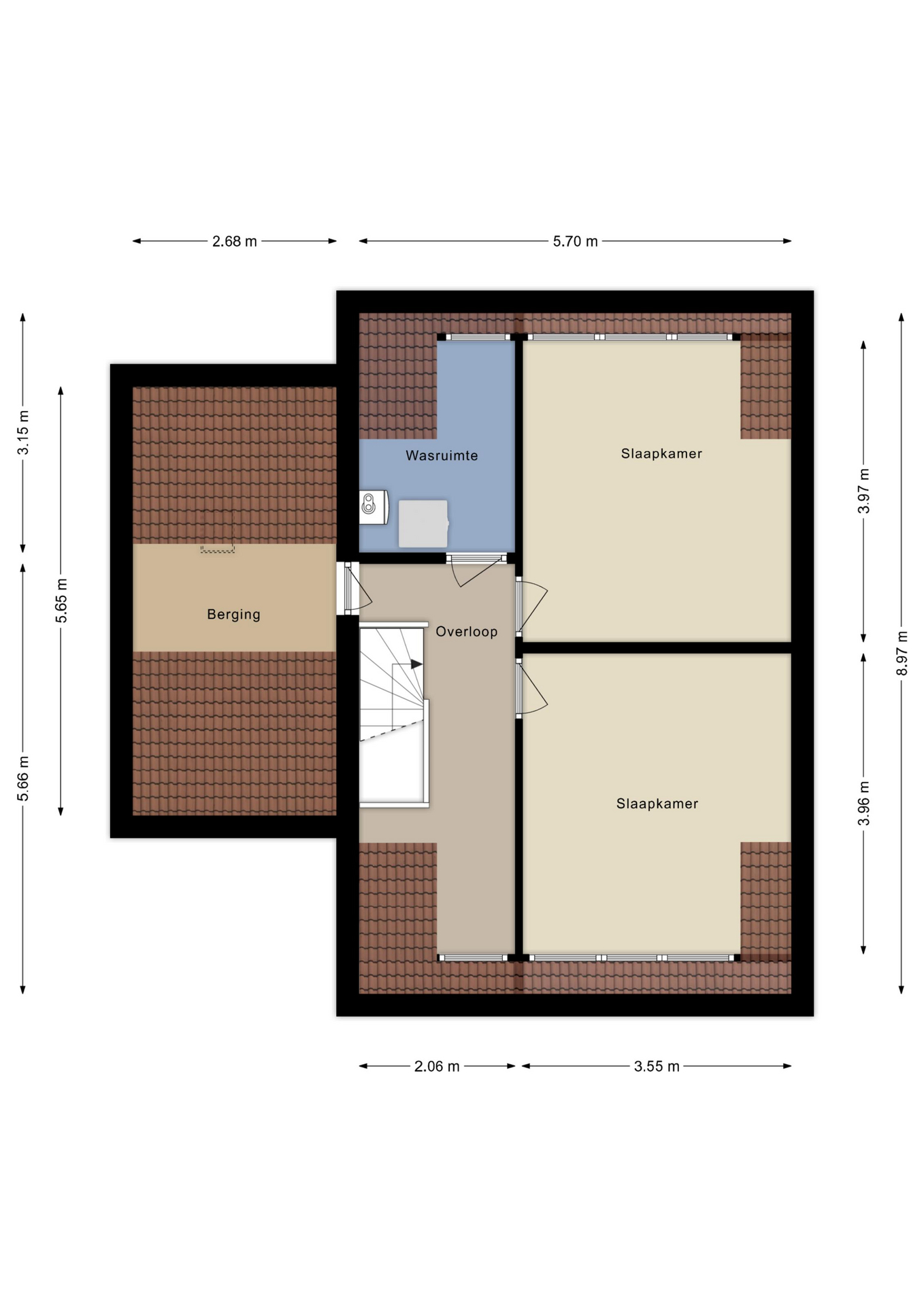 De zolderverdieping is ingedeeld met een overloop waar de mechanische ventilatie-unit zich bevindt, een aparte wasruimte met opstelling voor de wasmachine, droger en opstelling van de cv-ketel en een praktische bergkast. Daarnaast zijn er 2 ruime slaapkamers aanwezig, beiden met een dakkapel, wat zorgt voor veel licht en ruimte.