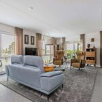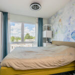 De woonkamer heeft grote ramen met deel inblindz, licht valt binnen en er is een vrij uitzicht over het groen van de polder en de stad. Twee deuren geven toegang tot het zonnige loggiabalkon op het noodoosten.