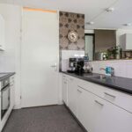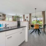 De keuken ligt achter een half hoge muur en is voorzien van inbouwapparatuur en veel kast-/en werkruimte. Er is meer dan voldoende plek voor een grote eettafel.