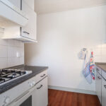 De keuken ligt aan de achterzijde van de woning en biedt toegang tot het tweede balkon. De keuken is functioneel ingericht met voldoende kastruimte. De flat beschikt over twee slaapkamers: een ruime kamer aan de voorzijde met vaste kast, en een tweede, rustig gelegen kamer aan de achterzijde. De badkamer is compact maar praktisch ingedeeld met een douche en een wasmachine aansluiting, het toilet is apart gesitueerd.