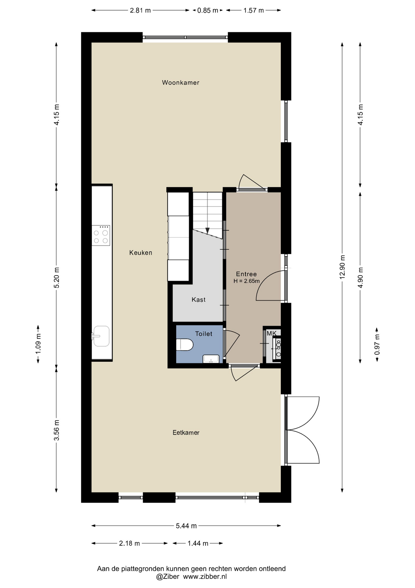Entree/hal met trapkast (opstelling warmtepomp en boilervat), garderobe, toilet en meterkast. Vanuit de hal toegang tot zowel de woonkamer als de eetkamer. De luxe keuken is voorzien van hoogwaardige inbouwapparatuur, zoals een vaatwasser, inductiekookplaat met geïntegreerde afzuiging, kokendwaterkraan, oven, combi-oven, koelkast en vriezer. De woonkamer en eetkamer hebben beide openslaande deuren naar de tuin en het water.