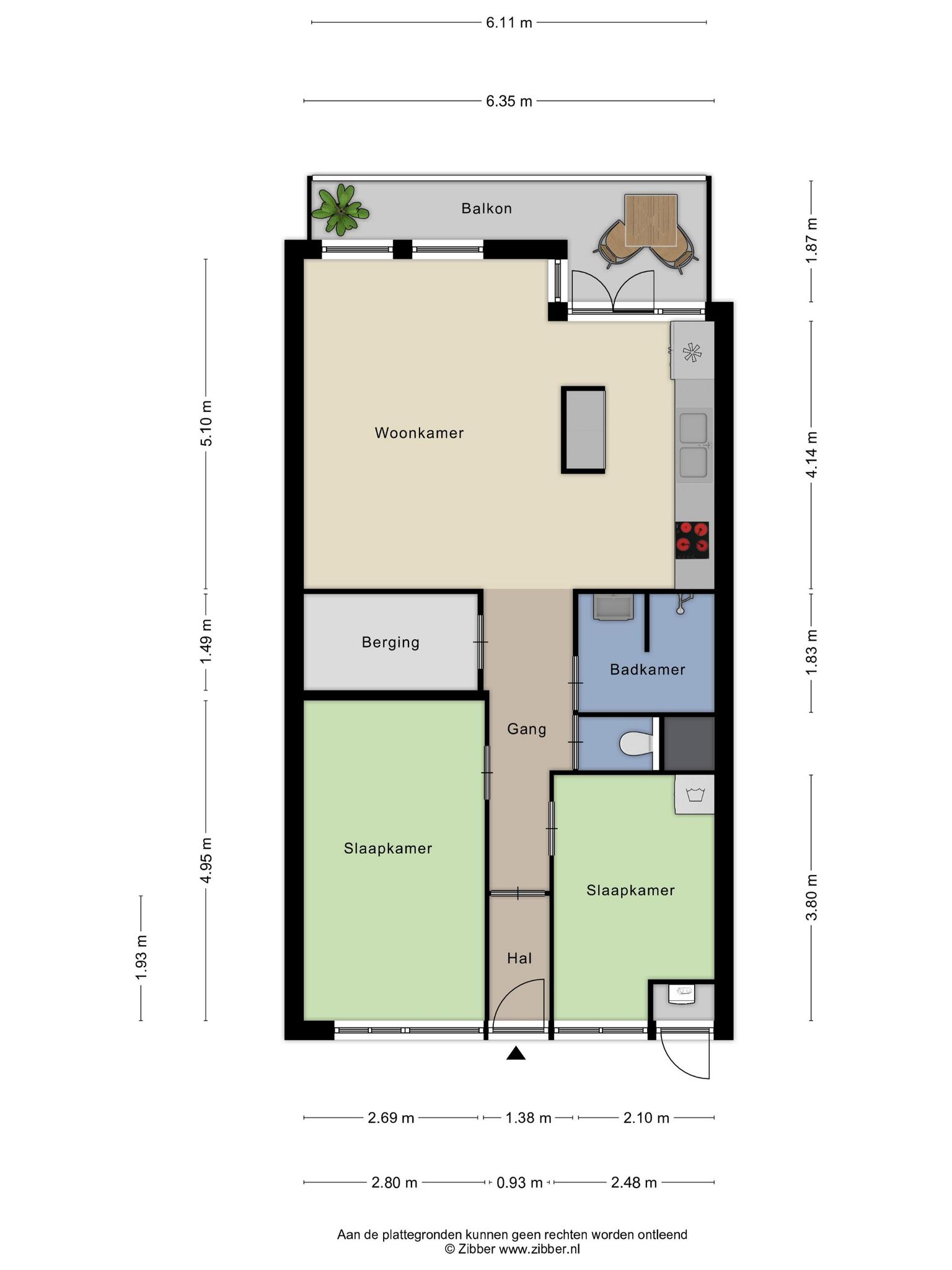 De hal/entree biedt toegang tot alle ruimten in het appartement, namelijk de ruime woonkamer met open inbouwkeuken, de moderne badkamer, een tweetal goed bemeten slaapkamers van 13 m2 en 9 m2, de inpandige berging en de meterkast.