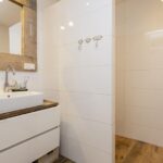 De woonkamer is ca. 20 m2 groot en voorzien van een nette vloer- en wandafwerking. Aansluitend bevinden zich het balkon op het oosten met uitzicht over het stadscentrum en de nette inbouwkeuken met vaatwasser, magnetron, oven, spoelbak en kookplaat. Ook de badkamer is in een moderne kleurstelling uitgevoerd en voorzien van een regendouche en wastafelmeubel.