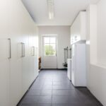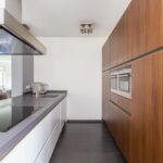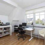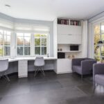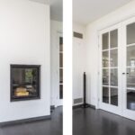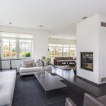 Het uitzicht op de tuin rondom de woning geeft veel vrijheid en rust. Ook in de woonkamer ligt de elegante plavuizenvloer met comfortabele vloerverwarming. U kunt verschillende zithoeken inrichten in de woonkamer, waaronder een sfeervolle plek bij de moderne open haard. Een opening in de wand geeft toegang tot de ruime leefkeuken met eethoek. De designkeuken met royaal kookeiland ziet er niet alleen fantastisch uit, maar is ook nog eens van alle gemakken en luxe voorzien. De keuken is uitgerust met hoogwaardige inbouwapparaten, zoals een inductiekookplaat, vaatwasser, combimagnetron, stoomoven, koelkast en vriezer. De leefkeuken biedt ruimte aan een gezellige eethoek. Schuifdeuren vanuit de keuken geven toegang tot een werkkamer. De kamer ligt in de erker en is bijzonder ruim en licht. Hier vindt u een vast, modern bureau, waardoor u de ideale werkplek met uitzicht op de tuin kunt inrichten.