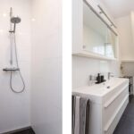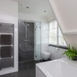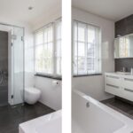 Via de trapopgang bereikt u de overloop op de eerste verdieping. Hier heeft u de toegang tot drie ruime slaapkamers, een badkamer, wasruimte en aparte toiletruimte. De slaapkamer aan de voorzijde is royaal en beschikt over een badkamer en suite en ruime inloopkast. Alle slaapkamers profiteren van veel lichtinval en zijn voorzien van een stijlvolle laminaatvloer. De afwerkingen zijn van hoge kwaliteit en de hoge plafonds zorgen voor een ruimtelijk effect. De eerste badkamer is op moderne wijze betegeld en uitgerust met een ruime inloopdouche met glazen deur en dubbel wastafelmeubel. De badkamer en suite is van nog meer luxe voorzien en hier vindt u een ligbad, inloopdouche, dubbel wastafelmeubel en toilet. Beide badkamers beschikken over vloerverwarming.