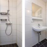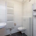 De badkamer is betegeld met een moderne tegel en voorzien van een inloop douche, vaste wastafel, toilet en de witgoedaansluitingen.