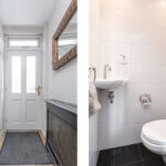 Hal met eikenhouten vloerdelen, gestucte wanden en paneeldeuren, moderne toiletruimte met hangend closet en fonteintje, meterkast met nieuwe en uitgebreide groepenkast, trapopgang en toegang tot de woonkamer.