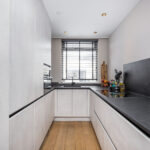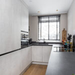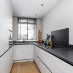 De keuken ligt aan de voorzijde van de woning en is in 2024 voorzien van luxe en modern keukenblok in U-opstelling met aangenaam veel werk- en kastruimte en hoogwaardige AEG inbouwapparatuur, te weten: koel-/vriescombinatie, inductie kookplaat met ingebouwde afzuiger, combimagnetron en vaatwasser. Het iets verlaagde en glad gestucte plafond is voorzien van inbouwspots voor de benodigde verlichting.