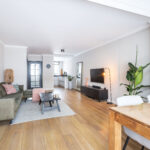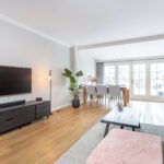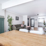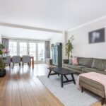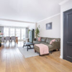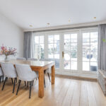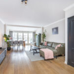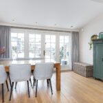 De royaal bemeten en tuingerichte woonkamer is circa 2,5 meter uitgebouwd en heerlijk licht door de grote glazen achterpui en openslaande deuren. De sfeervolle living is afgewerkt met eikenhouten vloerdelen en gestucte wanden -en plafond met sierlijst en is daarnaast voorzien van een trapkast en convectorput.