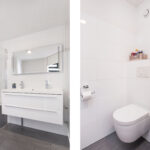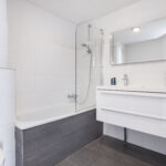 De gemoderniseerde badkamer is ruim van afmeting, geheel betegeld en voorzien van een ligbad met thermostaatkraan, breed badmeubel met wastafel en twee kranen, spiegel, hangend closet en designradiator.