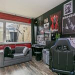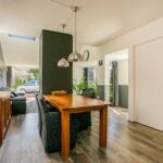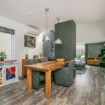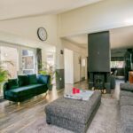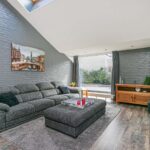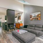 De uitgebouwde en speels ingedeelde living is heerlijk ruim van afmeting en enorm licht door de grote, tot aan de grond reikende raampartijen, het Velux-dakraam en de openslaande tuindeuren. De kamer is voorzien van een laminaatvloer en structuurverfwanden en beschikt over een houtkachel, die in de avonduren veel sfeer brengt. Tevens beschikt de living over een airco-unit.
