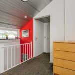 Ruime overloop met vloerbedekking, glad gestucte wanden en hoog plafond, moderne toiletruimte en vaste kast met CV-opstelling, wasmachine- en drogeraansluiting en mechanische ventilatie.