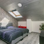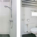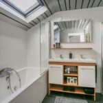 De gemoderniseerde en geheel betegelde badkamer is ruim van afmeting en beschikt zowel over een ligbad met thermostaatkraan als een inloopdouche met thermostaatkraan alsmede een badmeubel met dubbele wastafel, designradiator en Velux-dakraam.