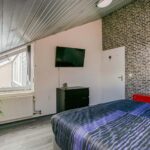 Via een schuifdeur in de hal is de, volledig voor rolstoelgebruik aangepaste, ruime slaapkamer met eigen badkamer toegankelijk. De slaapkamer heeft een afmeting van circa 15,5m2 en is voorzien van een laminaatvloer, glad gestucte wanden, vaste kast, airco-unit en een schuifdeur naar de aangrenzende badkamer.