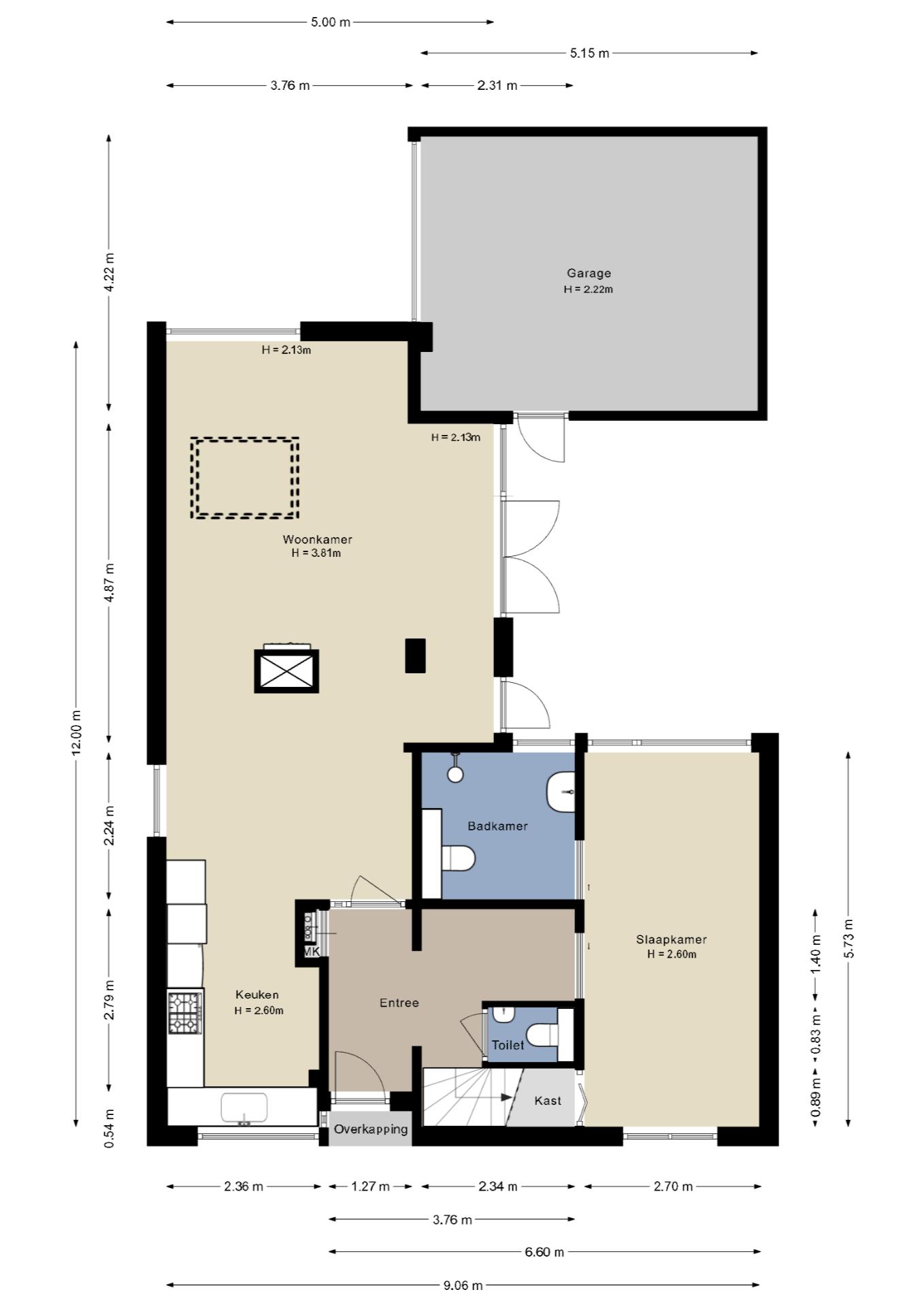 Via een loopdeur is de aangrenzende garage toegankelijk, die tevens beschikt over een overheaddeur naar de openbare weg. De garage heeft een afmeting van ruim 22m2 en is voorzien van elektra, dakkoepel en omvormer van de 9 zonnepanelen.