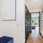 De zeer ruime, inpandig vergrote hal geeft toegang tot de berg- annex meterkast, toiletruimte en de toegangsdeur naar de woonkamer. De hal is afgewerkt met een visgraat PVC-vloer met vloerverwarming, glad gestucte wanden -en (hoog) plafond en mooie paneeldeuren en de moderne toiletruimte is voorzien van een hangend closet en een fonteintje.