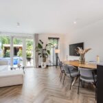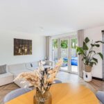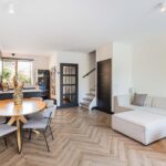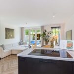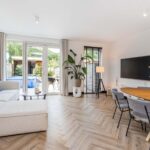 De tuingerichte woonkamer is voorzien van een prachtige visgraat PVC-vloer met vloerverwarming, glad gestucte muren -en plafond en trapkast. Door de grote raampartij met openslaande deuren is de living heerlijk licht en zonnig.